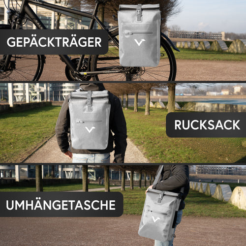 Du bist auf der Suche nach einem Fahrradrucksack, einer Gepäckträgertasche oder einer Umhängetasche? Mit der ValkOne vereinen wir alle drei Wünsche in einem Produkt.